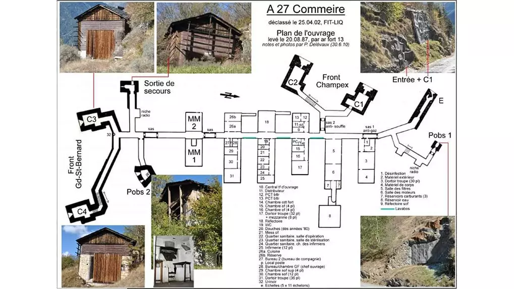 Conçu par la brigade de montagne 10, le fort de Commeire était équipé de 4 canons 7,5cm (portée de tir 6,5 à 11,5 km) et de trois positions d’observation. Construit entre août 1940 et septembre 1943, il était équipé à l’origine de canons de campagne Krup datant de 1903. Le fort a ensuite été équipé de canons de forteresse en mai 1944. Les travaux de camouflage ont été terminés en 1947. Le fort pouvait accueillir 140 soldats dans les différentes chambres à disposition.